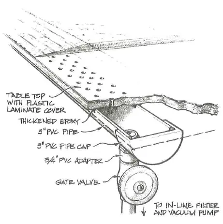 A vacuum hold-down feature can be incorporated into a table to hold individual sheets of plywood in place while you machine scarf bevels. This feature works especially well when using the router box technique described in the scarfing article. You’ll need a fairly large vacuum pump. We use an oilless rotary vane vacuum pump made by Gast, Model No. 3040-V115A. It generates 25 cubic feet per minute (cfm) at no vacuum and 5 cfm at 20″ of mercury. Smaller units may work, but lots of cfm and reasonably high vacuum are required when plywood is warped or rough. A vacuum table will work most efficiently holding down smooth, flat plywood panels.
