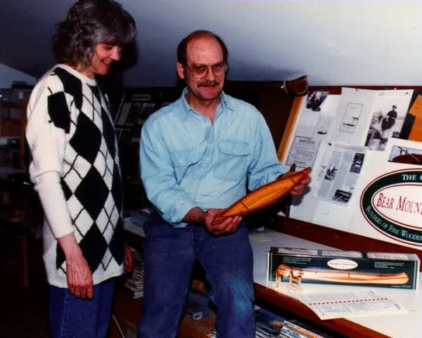 Above: Ted Moores and partner Joan Barrett showing off their wooden model canoe kit.