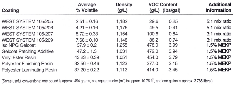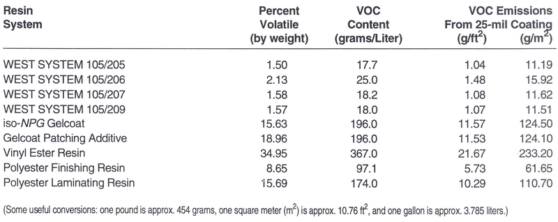 The epoxy products offered by Gougeon Brothers can offer substantial reductions in VOC emissions compared to conventional polyester and vinyl ester resins. All Gougeon epoxy products used for coating, laminating or general bonding were tested for volatile emissions to compare them to other products on the market and to demonstrate that the products comply with the federal Clean Air Act and other air quality regulations.