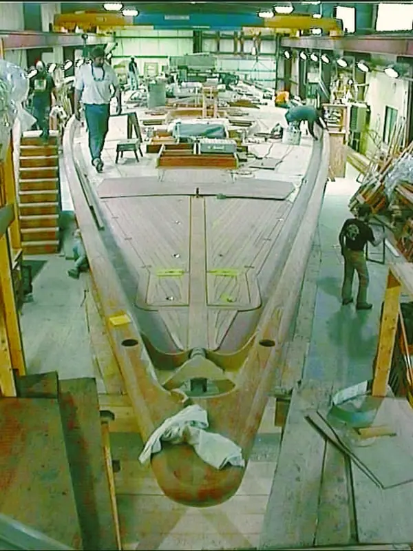 On deck, the final sections of the teak cap rail were being painstakingly scarffed together. Below deck, the marble fireplace and pipe organ have been installed in the salon. Carpenters with an obsession for perfect joinery were fitting the remaining pieces of cherry trim, while painters, ready for the first coats of varnish, worked around them.
