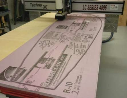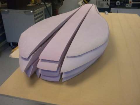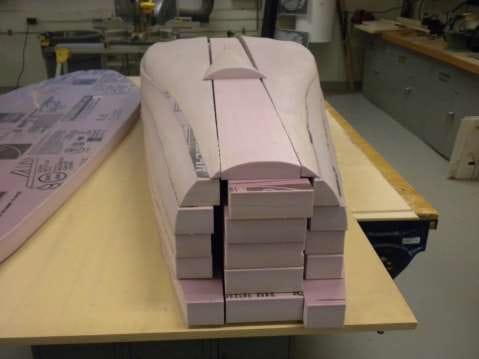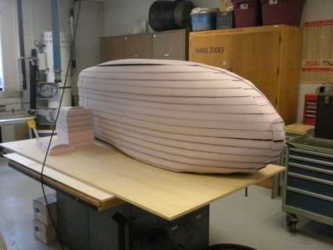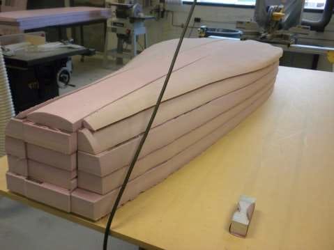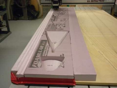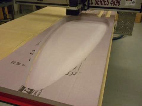 The mold plug was designed using a computer aided design (CAD) software package to create a three-dimensional solid model. The CAD model was sliced horizontally into sections 1.8 inches thick in preparation for machining the 2-inch thick foam sheets. The CNC router table has a vacuum system that holds down the pink foam and keeps it flat to the table while cutting it with a ½ inch ball end mill. Once each piece is shaped, the top surface of the foam is machined down flat to bring the thickness from approximately 2 inches to exactly 1.8 inches thick.