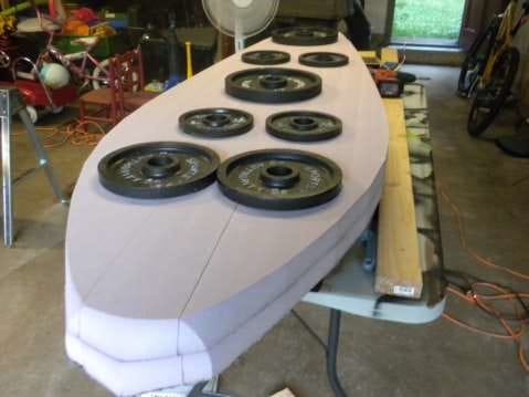 Each layer is weighed down prior to screwing in order to maintain a flat surface throughout the assembly process.
