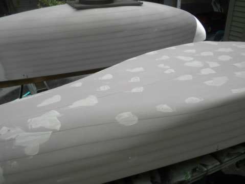 There will also be low lying areas and recessed screw head holes on the mold plug. These are easily filled in with drywall joint compound. Use it sparingly and remove excess compound with a moist sponge before it dries. The compound sands off rapidly like dust, so use a light touch. A second or third application may be required to fill up an entire area.