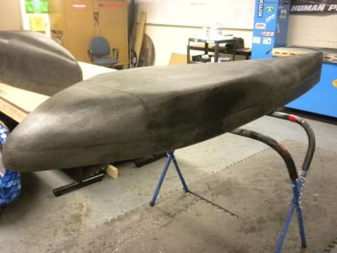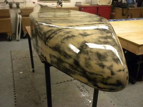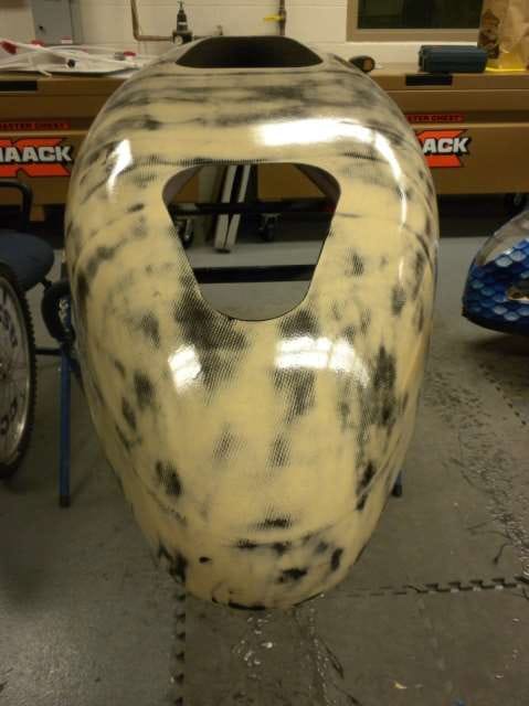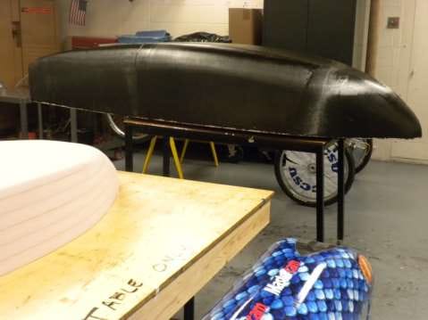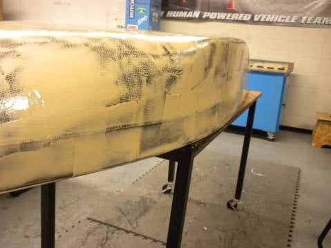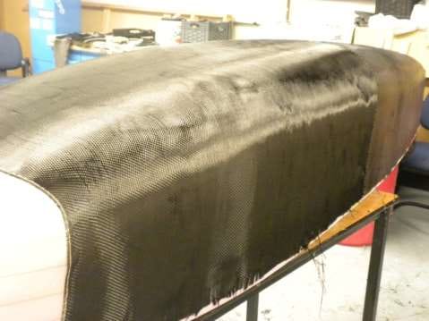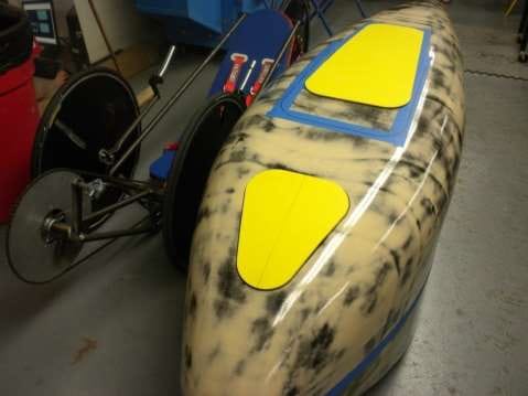 After the foam plug assembly was sanded to create the desired final look and shape, the plug was covered with one layer of Kevlar cloth and two layers of carbon fiber cloth to provide a durable and strong shell in the event of a rollover. WEST SYSTEM Epoxy was used to bond all the components at room temperature. The exterior of the shell was faired with WEST SYSTEM Epoxy blended with WEST SYSTEM 410 Microlight fairing compound to achieve a uniform smooth finish.