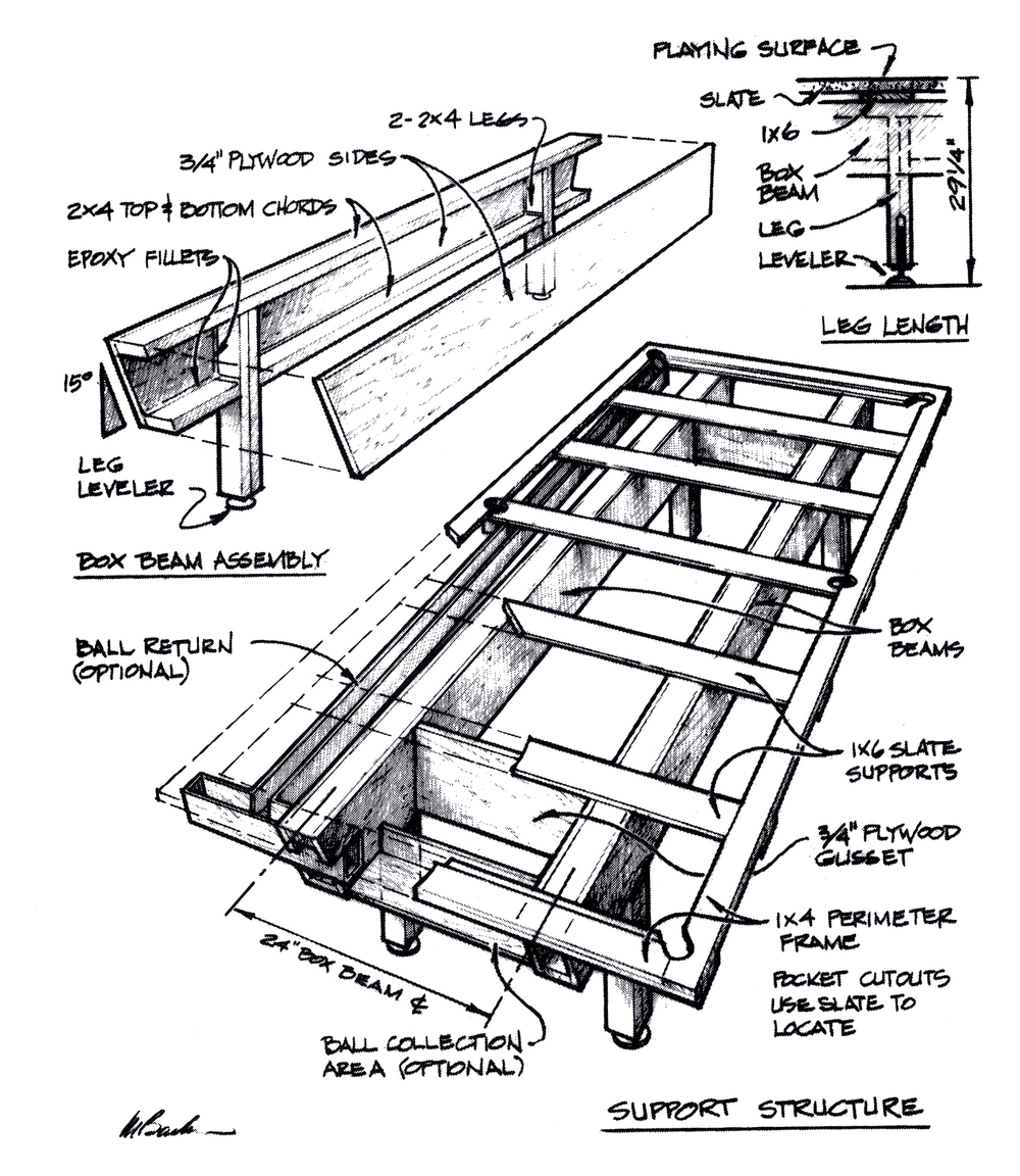 The structure of the table must be strong enough to support the slate, which can weigh as much as 400 pounds. Additionally, a player may sit on the edge of the table to make a shot; so add another 200 pounds. As you can see, a solid support structure is necessary.