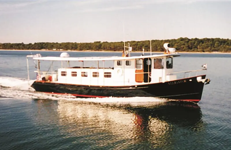 A 4.5 liter John Deere marine engine producing 130 hp is coupled to a 2:1 Twin Disk transmission and Aqua Drive (dual CV joint) system. One reason Alligator is so long (and low) is because the machinery spaces are located under the aft deck, accessible via a large hatch which gives plenty of room to do normal engine maintenance and, if necessary, even allow engine removal without removing or cutting any part of the boat. A sealed bulkhead faced with acoustical and thermal insulation keeps noise and odors isolated from the living quarters. Tanks under the cabin sole provide 800 gallons of fresh water and 300 gallons of diesel fuel.