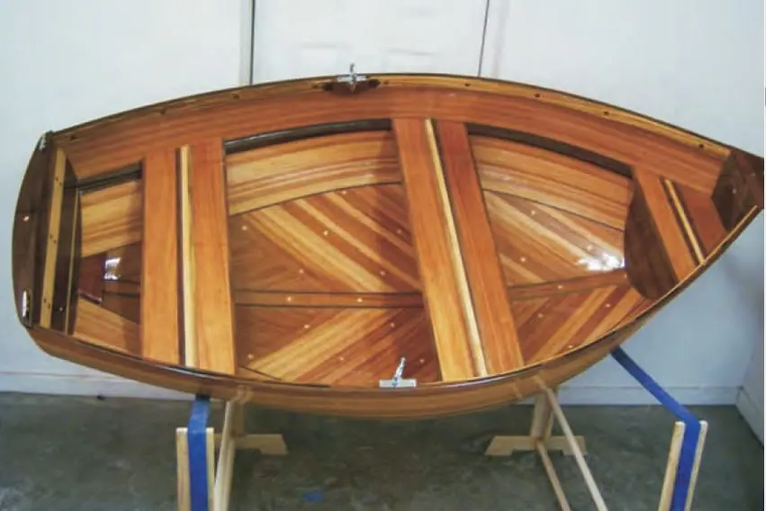 The plans called for 1/4″ western cedar strips. I selected African mahogany with accents of Tennessee walnut and a little bit of maple in the hull, and used zebrawood for the gunwales and cocobolo for oarlock pads. I used two layers of lightweight fiberglass glass and WEST SYSTEM® 105 Epoxy Resin® with 207 Special Clear Hardener® to seal my wooden treasure. A good friend and I bought John R. Clark’s plans for an 8′ Classic Dinghy. I rented a shop space, loaded in the appropriate tools, purchased the wood, and started ripping strips only 30 days after seeing my first wooden boat.