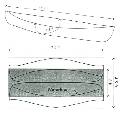 The canoe is 17.5 feet long, and has a maximum girth of 56 inches (measured around the bottom from gunwale to gunwale). Now let’s approximate the rectangular shape of the canoe if it were laid out flat. The length is 17.5 feet and the width is 4.5 feet (rounded to the nearest ½ foot) for a total surface area of 79 square feet. [17.5 × 4.5 = 79 sq. ft.]