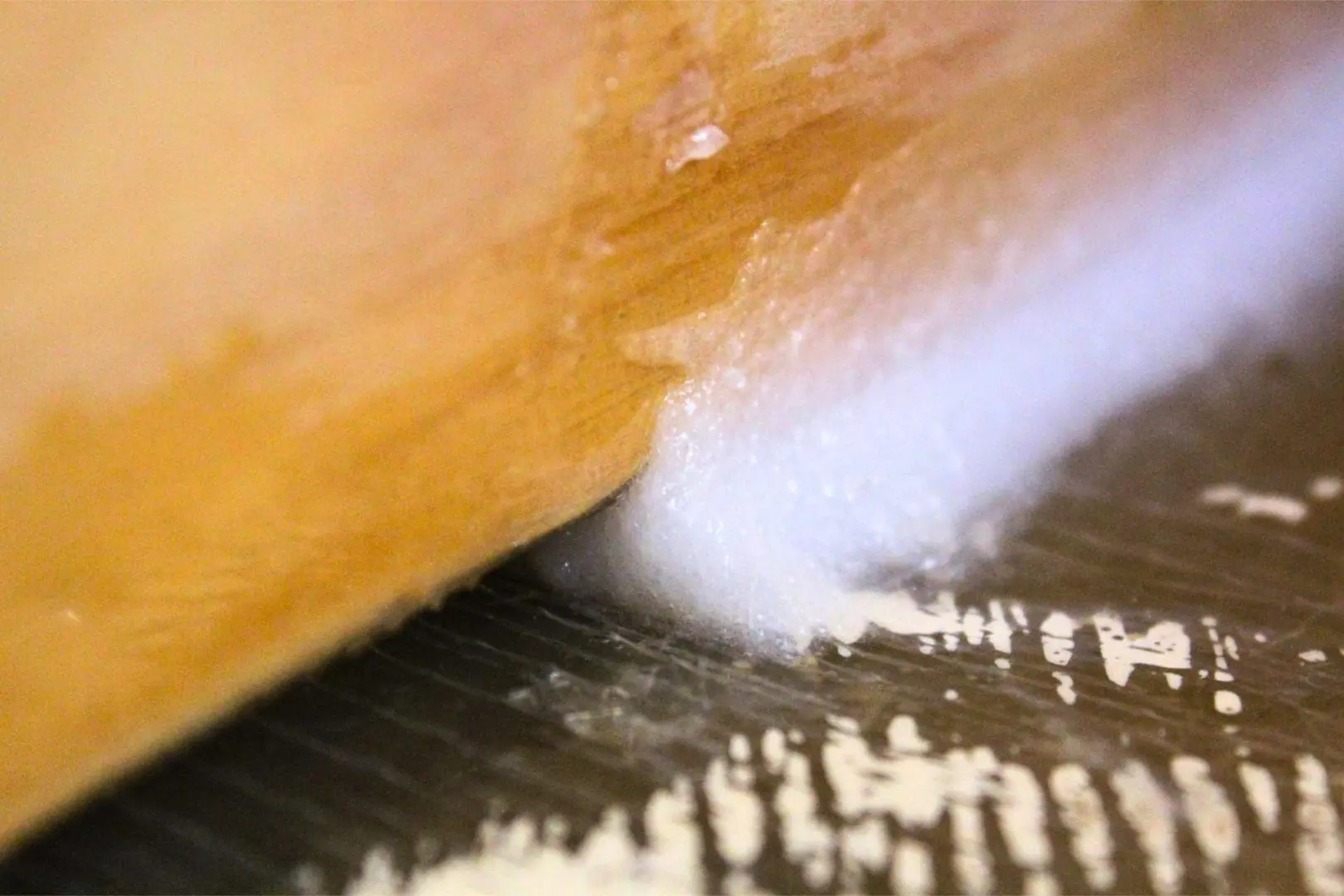 Hold the stick 90° to the corner to create a nice 3/8″ radius fillet. This is a good fillet shape for preventing air bubbles in a corner when applying lightweight fiberglass fabric. If you’re holding the stick at 45°, the radius will fatten up and give a more gradual transition for medium-weight fabrics.