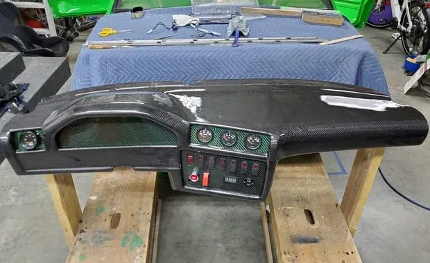 In a whole separate workstream, I wanted to make carbon fiber panels to hold gauges, switches, and fill the area where the instrument cluster was. For this, I used some fiberglass I had around the shop and some very cool fabric that has a green metal wire woven through-a nice accent given the car is all green.