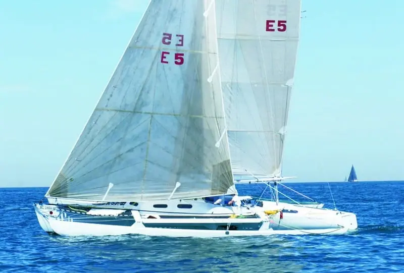 The 35′ trimaran Adagio, designed and built by Meade and Jan Gougeon in 1969, survived the harrowing conditions at the finish of the 2002 Chicago to Mackinac race this past year.