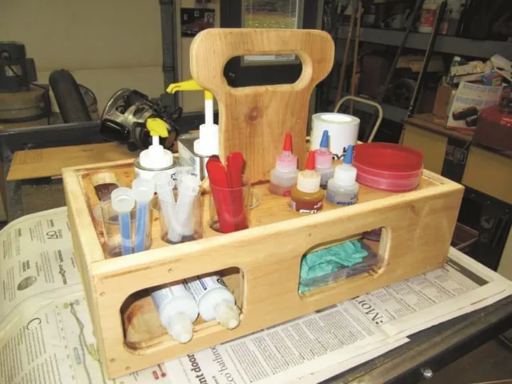 An epoxy caddy can be simple or as elaborate as you want. One could design it to become an epoxy workstation complete with storage for brushes, stir sticks, hand cleaner, gloves, paper towels, and so on. Or it could be designed simply with cutouts for containers and drip pots. One can simplify or expand upon the concept, tailoring it to meet your needs.