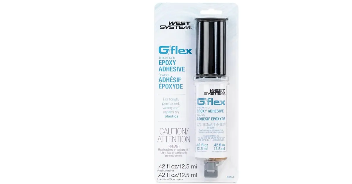 G/flex 655 is a 2-part, pre-thickened epoxy system that bonds tenaciously to plastics including HDPE, LDPE, ABS, PVC, Polycarbonate, and Hypalon. Its viscosity is similar to gel toothpaste so it won’t run or sag, even on vertical surfaces. The G/flex 655-1 dual syringe allows users to dispense the epoxy in very small quantities, providing big strength for little repairs.