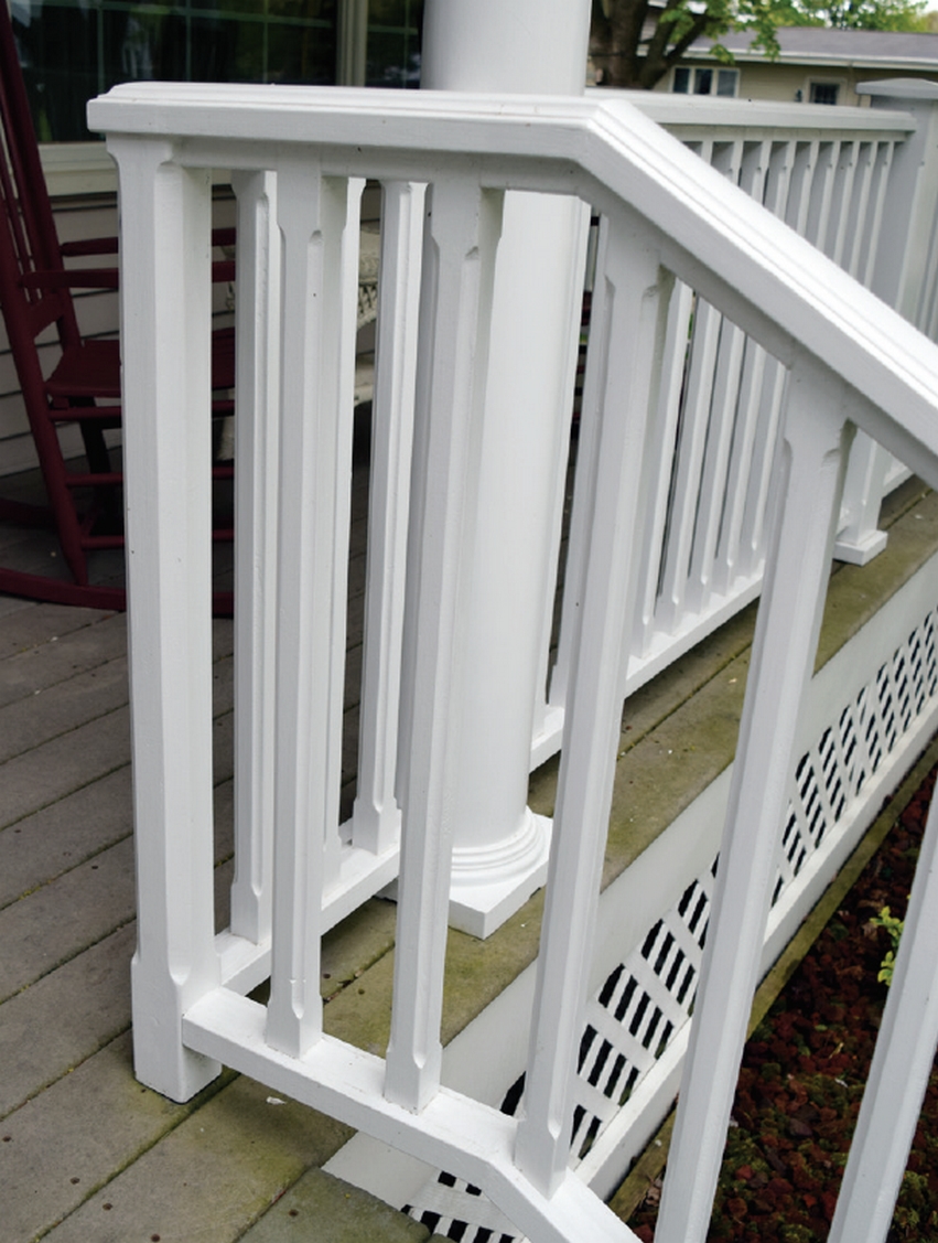 The freshly repainted railing with its decorative fluted spindles.