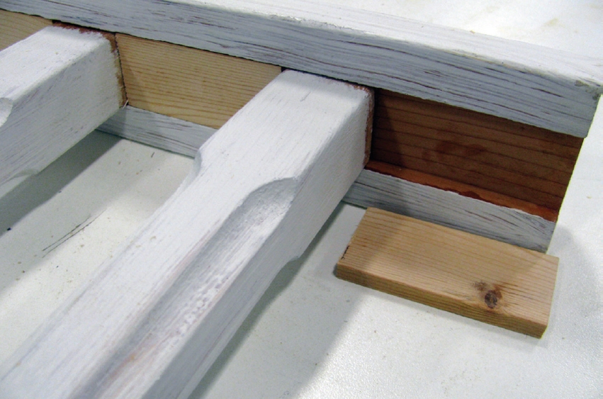 Small wood fill pieces were placed between the spindles to maintain even spacing.