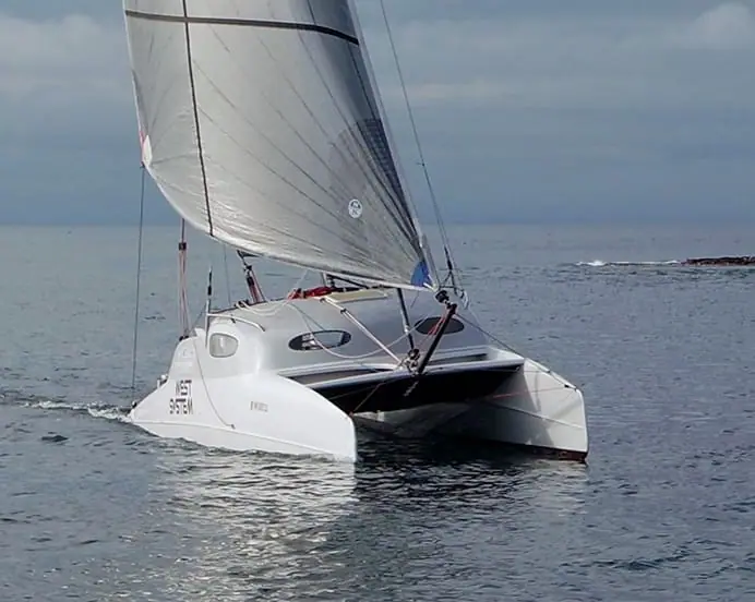 What is so different about the G-32 catamaran? It is a road legal (8 1/2′ wide), 32′ long trailerable catamaran. It’s the same width as a Hobie 16, yet twice as long. It trades initial stability for efficiency. The boat is very aerodynamic and has incredibly slender hulls, so the tiny rig pushes the boat at competitive speeds.