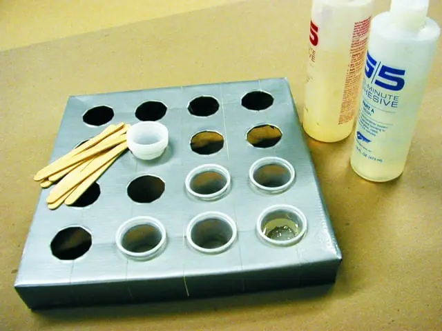 Above: To simplify mixing G/5 Resin and Hardener for a large project, Grant made a carrying pallet with sixteen holes, sized to hold 1-ounce mixing cups (pill cups purchased at a food service outlet). The pallet was covered with duct tape so glue drips could be peeled away. Note that a mini cupcake pan could be dedicated to this kind of task as well.