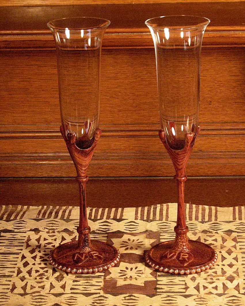 A few months back David called to ask what I thought about using G/flex 650 to glue hardwood to glass crystal. I said as long as both were clean and well abraded—no problem. Today he emailed pictures of what he had in mind at the time he’d asked the question. I think you’ll agree the glasses are amazing. Both sets of wine glass/goblets were made for use in toasting the brides and grooms at their wedding receptions.