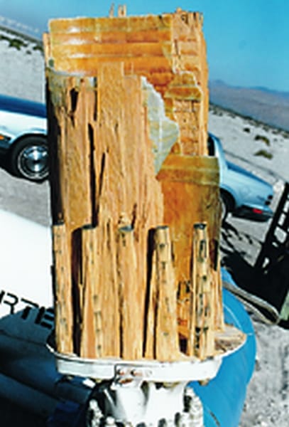 Any previous doubts about hardware bonding that remained from my first days on the job were erased a few weeks later when a crate arrived carrying the root-end remains of the wind turbine blades. Sure enough all of the studs were there, each with jagged wood/epoxy laminate still attached.