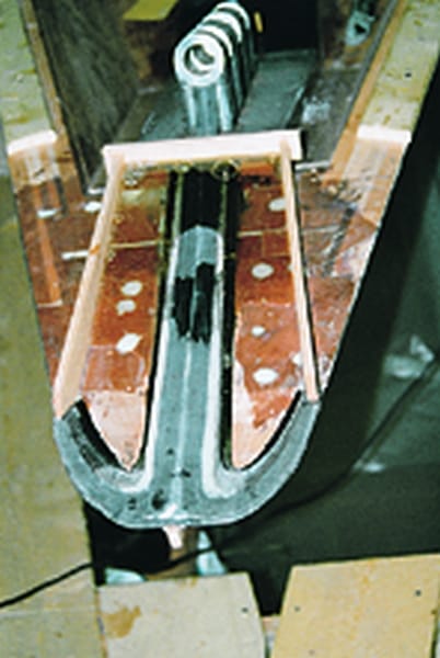 The photos (see gallery) show the huge head stay fitting of ANTONISA being glued in place. Creative Hodgdon employees devised a unique way of gluing in what Bruce King referred to as a headstay chainplate. The composite fitting was dry fit into an oversized slot in the stem. Then the void between the fitting and stem was filled with epoxy, which acts as a buffer between the high modulus plate and relatively low density wood laminate in the bow and stem.