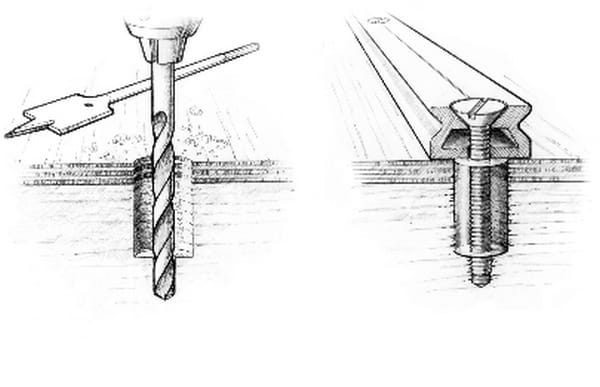 To gain additional side load carrying capability, countersink the original pilot or lead hole to remove the wood immediately surrounding the top of the screw. This creates a space for an epoxy annulus. The epoxy, with its high compressive strength, handles the point-loading of the screw much more effectively. The epoxy spreads the side load exerted on the screw into more of the surrounding area so the wood is not damaged in the process. (see More on Hardware Bonding)