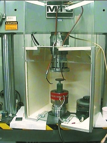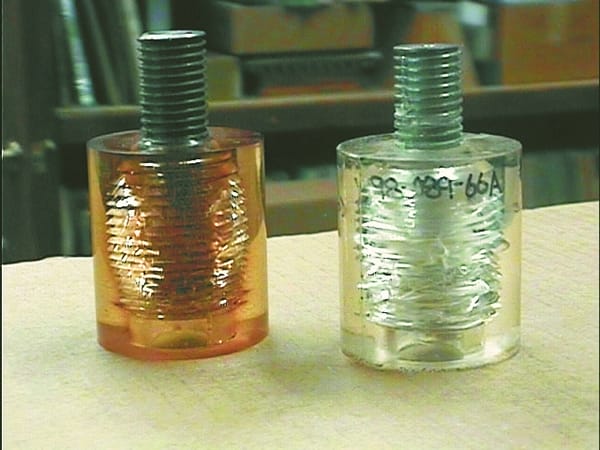 One of the fatigue tests we used and continue to use to screen epoxy formulations is the Annular Shear test. This test utilizes a cast-in-place fastener that is supported only by the epoxy attached to the screw threads. The tips of each of the metal threads sets up a stress concentration in the surrounding epoxy as a load is applied to the fastener. The load is applied and quickly released and applied again several times a second for several thousand cycles until the epoxy cracks or shatters. The test is run again on additional samples at a slightly higher and lower loads to predict long-term fatigue characteristics.
