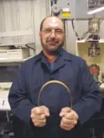 CAPTION: Research chemist Bruce Niederer personally conducted the grueling strain limit test in the Gougeon test lab. Neither he nor the sample cracked under the strain. Do try this at home.