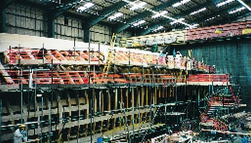 At the Jubilee Yard in Southampton England, progress continues on the Jubilee Sailing Trust ship. The ring frames are all erected, and for a short period, the completed skeleton of the ship resembled a giant toast rack.
