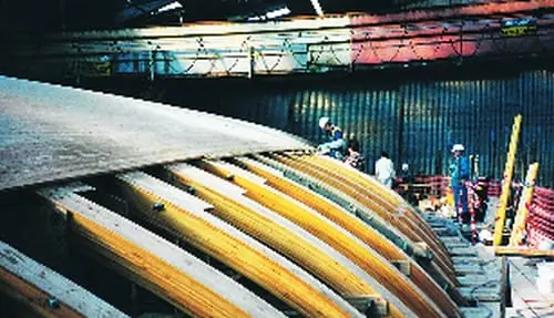 The builders began planking the hull in early January of 1998. The finished hull will sport five layers of multi-directional planking, which will provide the structure with enormous strength. A mixture of WEST SYSTEM 105 Resin, 205 Hardener and 406 Colloidal Silica is used for bonding the planks into position.