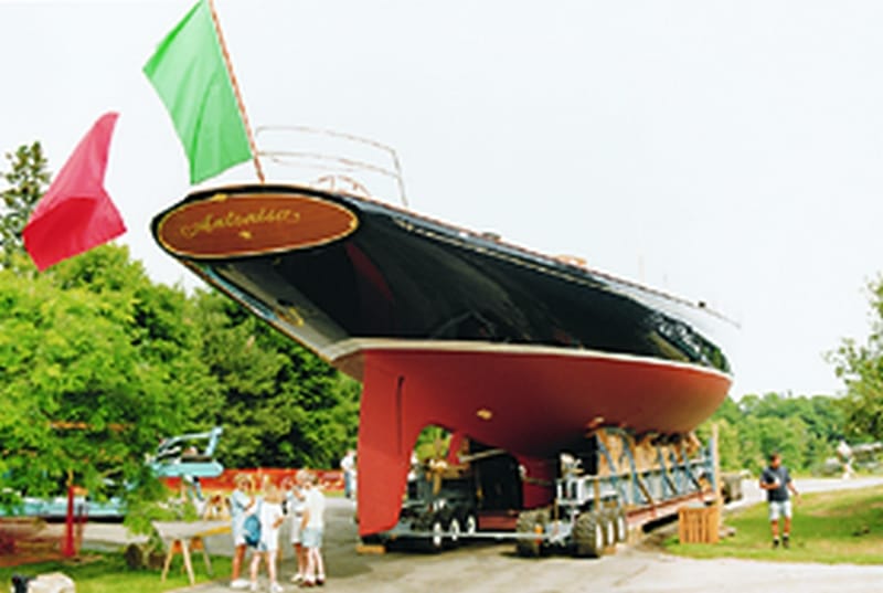 It took over seven hours just to winch the vessel out of the shop and a total of three days to travel the few hundred yards to the boat ramp. Steel plates laid on the curved roadway kept the yacht level, then extended the ramp far enough into the water for ANTONISA to float at high tide.