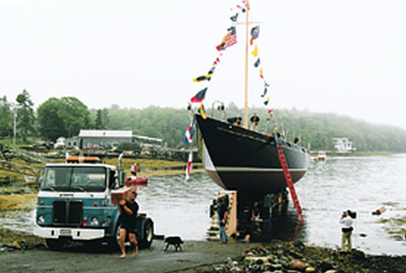 Launching didn’t end the work. ANTONISA was tied to the barge in deep water where divers inserted the centerboard. It was permanently fastened when ANTONISA was hauled a few days later at Sample’s Shipyard in Boothbay Harbor. The vessel draws 9.75′ with the centerboard up, 26.5′ with the centerboard down.