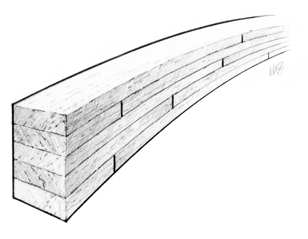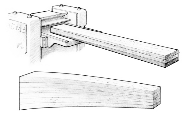 The reality of flaws in solid wooden components underscores the advantages of laminating wooden parts. With laminating, you can assemble the pieces, or plies, of a laminate stack to build a part to a specific shape (almost as if it grew to that shape) — orienting wood grain to address predicted stresses, minimizing waste, and reducing and dispersing flaws.