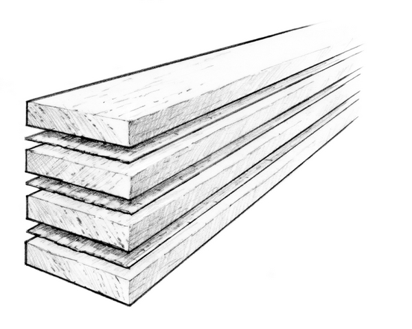 Often it makes sense to place high-modulus/high-strength wooden plies, such as ash or mahogany, furthest from the neutral axis (top and bottom), and lighter, weaker materials such as cedar or spruce in the center. This method puts the stronger, heavier materials where the loads are the greatest and lighter materials where the loads are less, much like building an I-beam. It offers greater strength with less weight.