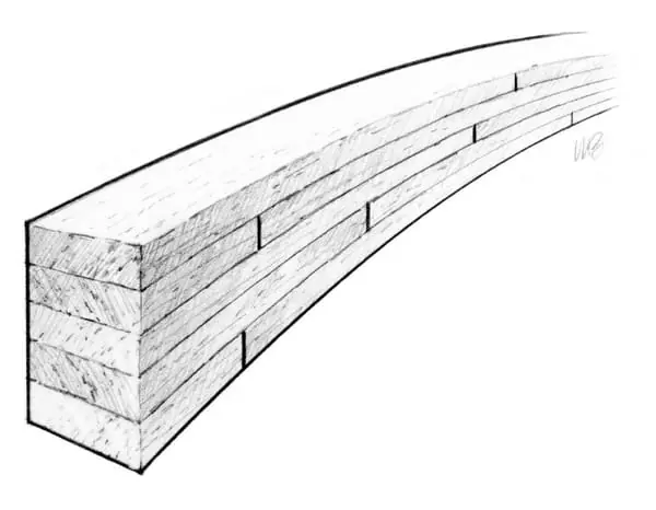When I was a kid, my older brother had a slingshot that was fashioned from a tree crotch. The wood fibers neatly followed the desired shape and nicely addressed the forces when operated. Centuries ago, many large ship components — knees, hooks, and floors were selected from forks, crotches and crooks of trees for much the same reasons. One-piece wooden parts were very reliable and the naturally grown beams and frames were key components of ship construction. As the availability of large naturally shaped timber diminished, large curved components were made of stacked and mechanically fastened smaller pieces of wood. Laminated wood structures weren’t possible until the relatively recent development of strong adhesives.
