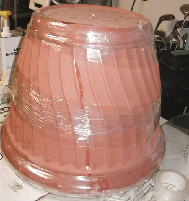 Above: The cracked polyurethane foam planter pot upon which Tom performed this simple pot repair with epoxy. You can see the household cling wrap he used to hold the cracked pot together while the epoxy cured.