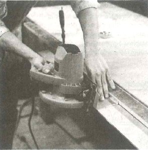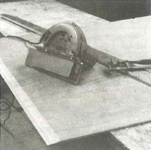 Set this tool up with a clamping bar to hold the plywood flat against the table. The clamping bar can include a feature that will protect the operator from the exposed saw blade while the scarf is being cut. This unit lets you use the saw without modifications. Nothing is attached to the circular saw, and the retractable blade guard is left to operate freely. This is worth noting, because hand-held routers and power planes are not equipped with safety guards. You must handle them more carefully because the cutters spin freely for several seconds after you turn the tool off. It’s a good idea to set up a special tool rest when using routers or planers, so you can safely set them down while the cutters are still spinning.
