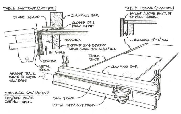 There is a method that works well and doesn’t tie up your power tools. It calls for a circular saw to cut the bevel along the end of a plywood panel. The saw is guided by a track mounted on the end of the table, below the table’s edge. You can make the guide of ¾” plywood. Mount it at the appropriate angle to form an 8-to-1 bevel, with relation to the table top, when the saw is set for a normal 90° cut. The plywood forms a flat plane that the base of the circular saw can follow. A permanently mounted straight edge strip holds the saw at the appropriate height and guides it along the length of the cut (below).