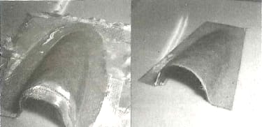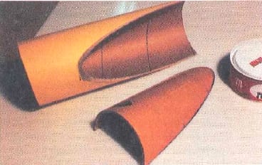 I placed a layer of 1/32″ patternmakers sheetwax in the female mold, to create a cavity in the male mold when it is cast against the female half. The wax easily conforms to the cylinder and the flange, duplicating the finished hood. Patternmakers sheet wax is available in various thicknesses. If you require more laminate thickness for reinforcing in a particular area, add successive layers of wax and use an iron to melt and smooth the step transition.