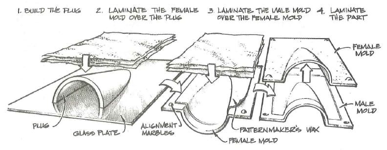 I waxed the exposed areas of the female mold surface (including the marbles) and coated the surface with epoxy. After the coating gelled, I wet out multiple layers of fiberglass, laid them over the female mold surfaces, and allowed them to cure. I applied plenty of glass to produce a rigid mold. The two matching mold halves must be rigid enough to resist deforming under clamping pressure that is firm enough to press the wet laminate into the cavity between the mold halves. When it cured, I separated the two molds and removed the wax. The marbles stayed attached to either one of the molds.