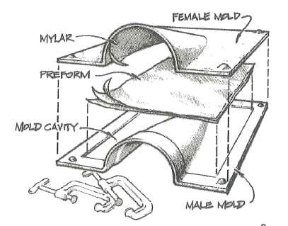 By contrast, in a closed “matched” mold, both top and bottom surfaces of the part are in contact with the mold, resulting in two finished sides. The top mold and bottom mold match when clamped together and a cavity the shape of the finished part, between the two halves, is filled by the wet laminate. The cavity and laminate thickness can be constant throughout or varied to provide added strength in specific areas or produce a 3-dimensional shape, such as a foil shape. What’s nice about this construction method is, it doesn’t require special equipment, like a vacuum pump.