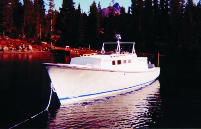 Eric Molsted of Sisters, Oregon recently completed and launched this 26′ cruiser. The hull is strip-planked 1″ x 7/16″ hemlock, fiberglass inside and out. Eric used WEST SYSTEM Epoxy throughout. With a 25 HP outboard, this cruiser will do 14 knots. He hopes to scale the boat to 31′ or 36 ‘ with an inboard engine someday.