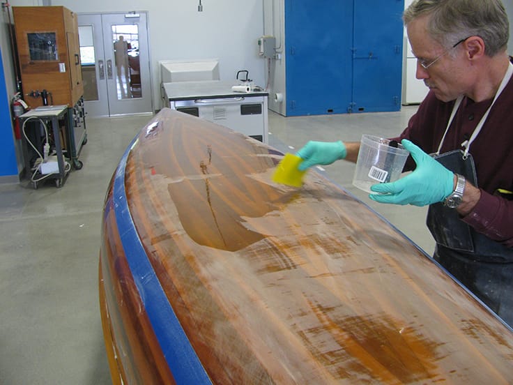 Now refairing the bottom with epoxy fairing compound would be easy to do but I wanted the hull to remain clear. This meant I could not use epoxy fairing compounds because it would hide the wood grain. So I taped off the perimeter beyond the low spots and sanded the surfaces dull. Because it would require several coats of WEST SYSTEM 105 Resin and 207 Special Clear Hardener to fill the low spots I added a bit of G-5 Five Minute Epoxy to the mix. This helped the clear 105/207 epoxy to gel sooner which allowed another coat to be applied an hour later.