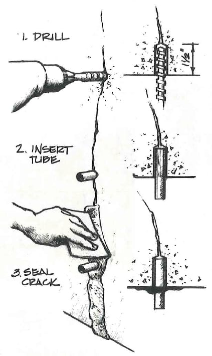 To fill the crack, you will need to install filling tubes (which also serve as vents) every couple of feet. Use a hammer drill to drill holes, centered in the crack, and the same size as the outside diameter of a piece of copper tubing. Many times the crack is not perpendicular to the surface, so you may have to drill at an angle to follow the crack. Use a 3/8″ drill for narrow cracks. This will accept a 3/8″ outside diameter (o.d.) copper tube. If the crack is wider, use a 5/8″ drill and 5/8″ o.d. copper tube. Drill into the crack 1½” to 2″ deep so the epoxy will be able to fill the crack more easily. Push the tubing into the crack until it bottoms in the drill hole. Allow at least an inch to extend beyond the wall surface. When the job is complete, you will grind off the excess tubing.