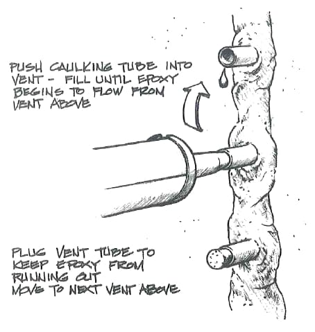 When epoxy flows from the vent tube, you can assume the crack is full of epoxy to that point. Plug the original copper fill tube with a cork or crimp the pipe and move to the next vent tube. Inject more epoxy into that tube until it comes out the next vent tube. Continue in this manner until you have injected epoxy into every tube in the crack.