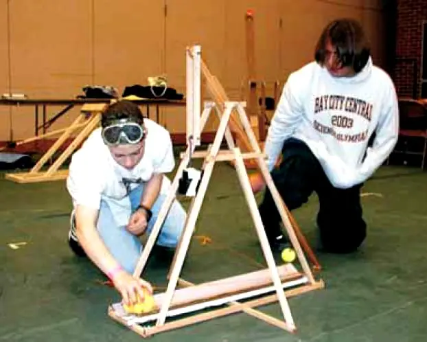 The trebuchet competition requires that a projectile (usually a tennis ball) be thrown via a sling at a cardboard castle. Event scoring is based on distance and accuracy. The counterweight and the projectile are provided at the competition site, and the trebuchet team is given time to adjust the placement of their machine for distance and accuracy. There are a number of rules and measurements that the trebuchet must be built to in order to qualify for use in the competitions. Be sure to locate an up-to-date copy of the rules, because rules at local competitions can vary. The web also offers a large number of excellent sites that feature a wide range of kits, designs, and construction details. Some designs are complicated while others are simple.