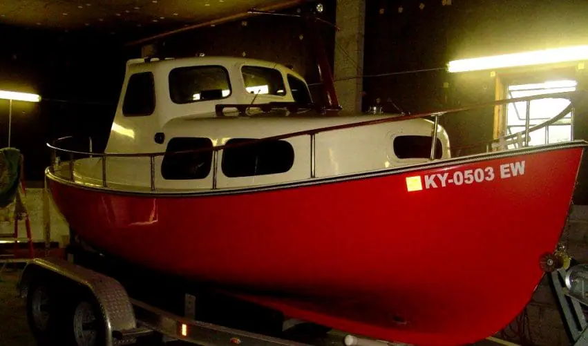 By the time I towed this 3,000 lb. boat to Kentucky, it was in need of a lot of work. The gel coat was almost completely gone and was brush painted with green house paint. All the wood inside had rotted away, the paint was peeling and the prop had fallen off. The hull is ½” to ¾” thick and in very good condition.