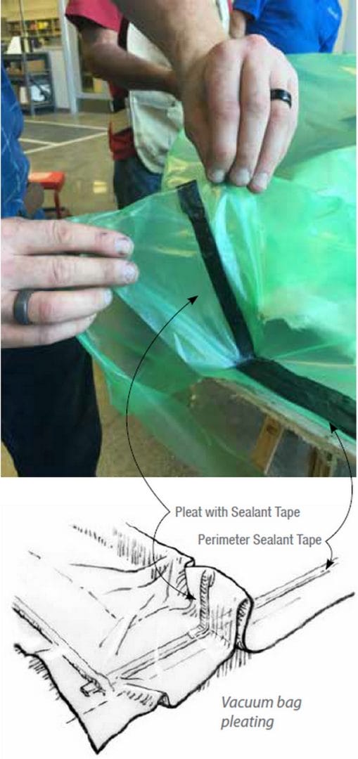 Where there is a corner or bend in the part, put a pleat in the bag. This is a fold that sticks up and allows the vacuum bag to move and conform nicely to the part under vacuum.