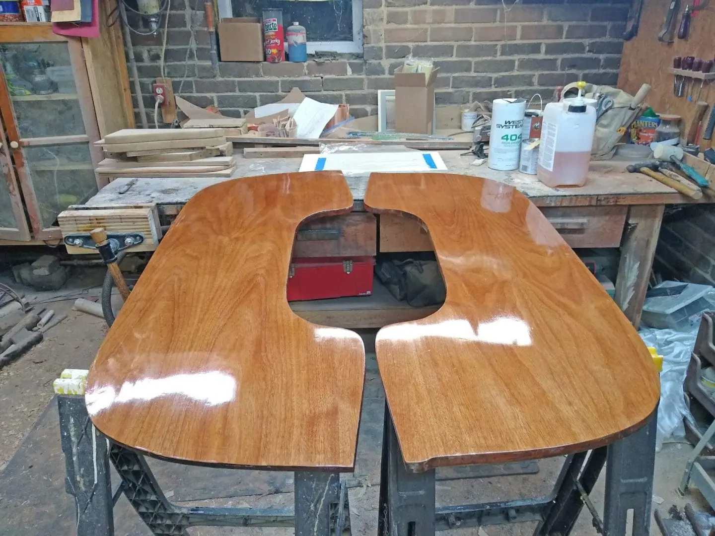 After doing all this work, I decided the original transom wood was too marred so I added a layer of mahogany veneer. Since I don’t have a veneer-clamping table, I simply used another transom as the clamping table.