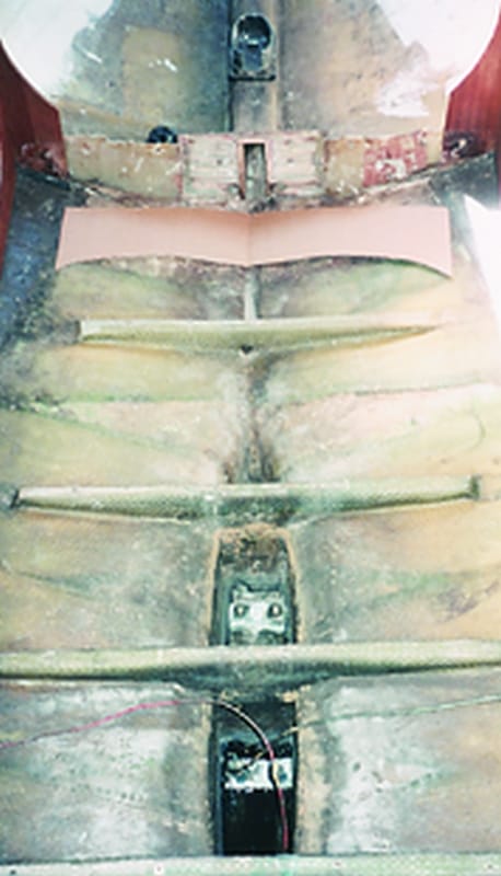 When the replacement wood was ready to be bonded in, we sanded the remaining FRP surfaces with 80-grit paper to prepare for secondary bonding. As the photo reveals, the mast support stringer is an FRP laminate over a plywood form. We made sure the plywood form was well dried before bonding in the repair pieces. We cut the bulkhead replacement with scarfed ends to match the cuts in the bulkhead.